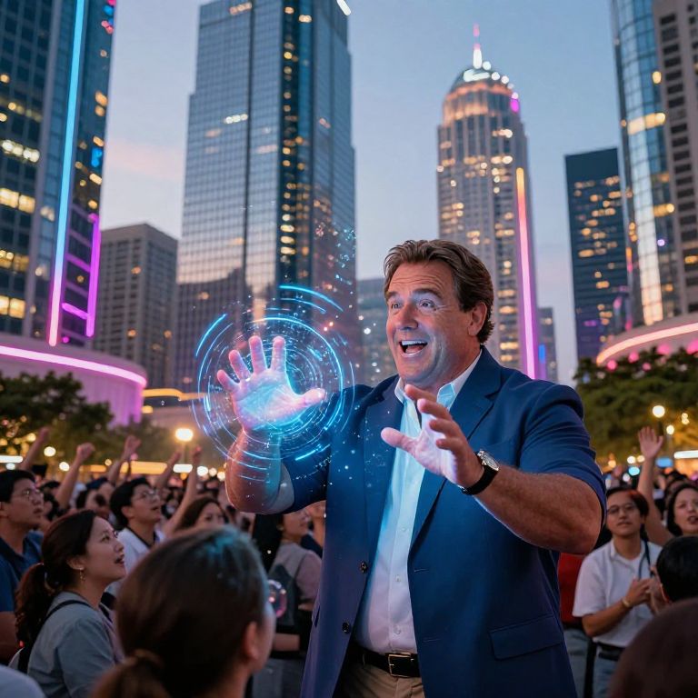 Photograph of a middle-aged man with light skin and short brown hair, wearing a dark blue suit, white shirt, and black belt, standing in a bustling urban plaza at twilight. He is energetically pointing at a glowing blue hologram of a hand hovering in front of him. The background features tall illuminated skyscrapers with neon lights in pink, blue, and white, and a crowd of diverse people watching. The man's expression is enthusiastic, and the hologram appears to be emitting a soft blue light. The image captures a dynamic, futuristic atmosphere.