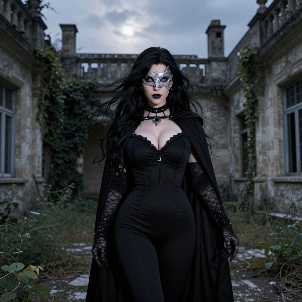 A mysterious black party outfit woman in a gothic costume, standing alone in an abandoned mansion courtyard at twilight. She has sharp facial features, pale skin, and deep lavender eyes, her long black hair flowing in the breeze. Her costume includes a full black bodysuit with a cloak and black lace gloves, and a silver mask covering her left side of face. The setting is overgrown with ivy and old stone walls, with faint moonlight filtering through the clouds.. The woman has big tits and cute face