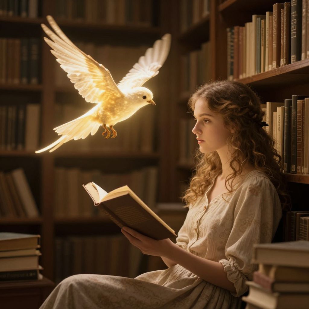 In a serene library bathed in golden light, a woman engrossed in reading is accompanied by a luminous bird that defies gravity, hovering serenely above her, as if bridging the realms of knowledge and wonder.