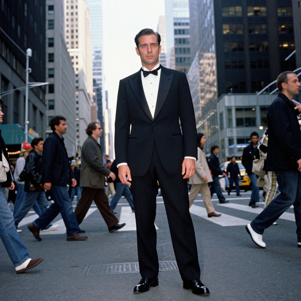 A man, classic black tuxedo, satin peak lapels, crisp white dress shirt, black bow tie, polished black patent leather shoes, urban gridlock chaos, towering skyscrapers reflecting sunlight, bustling pedestrians crossing streets, 3M analog film stock, confident expression. Man has masculine face and piercing eyes