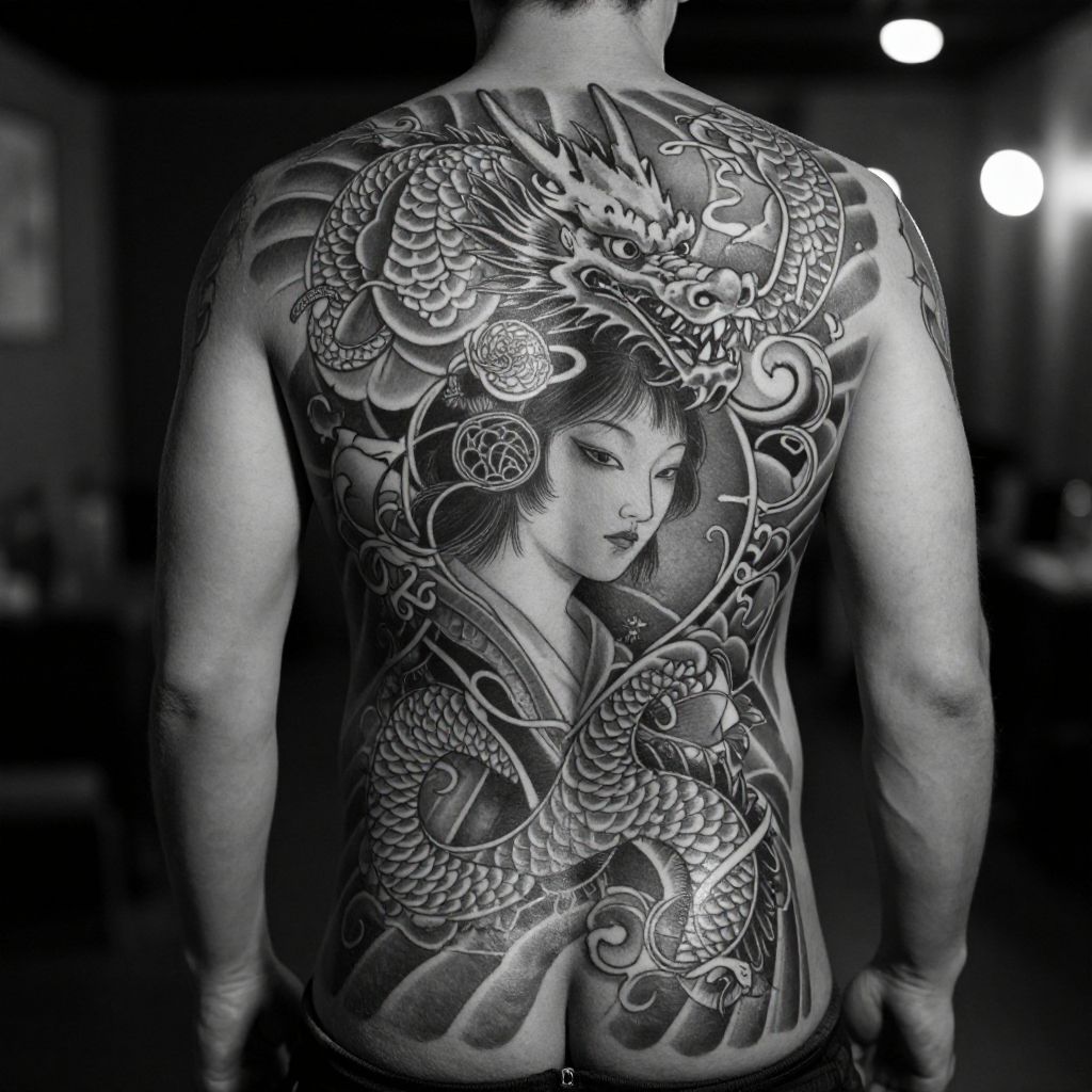 Tattooed man in side profile, showcasing intricate Japanese dragon and samurai woman design, vibrant colors, traditional shoji screen background. Photoreal