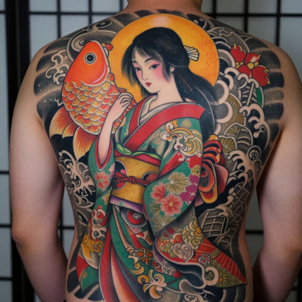 Photograph of a heavily tattooed person from the waist up, featuring a vibrant, colorful dragon and traditional Japanese-style woman with flowing black hair, intricate patterns, and bold colors like green, red, and black. The background is softly lit with a wooden shoji screen, creating a warm, traditional Japanese atmosphere. The tattoos are detailed and vivid, covering most of the person's torso.