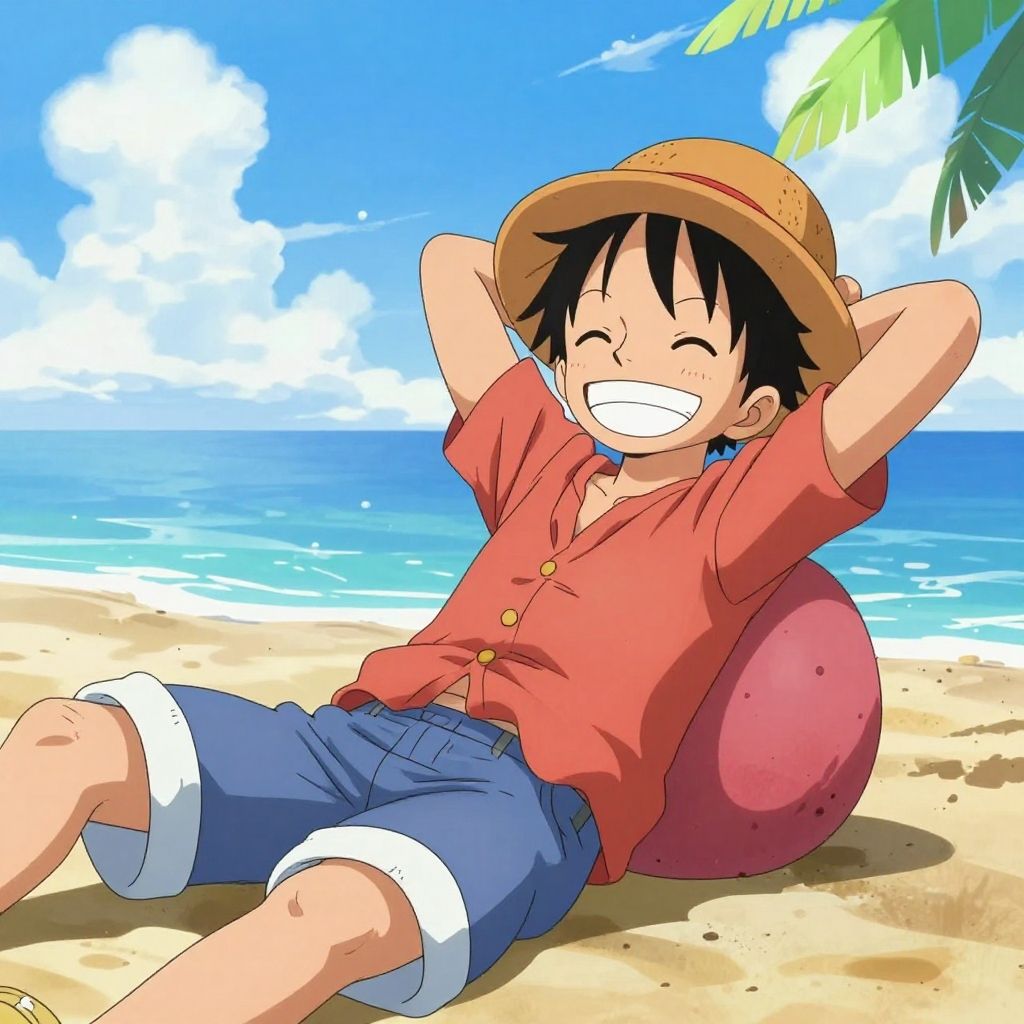 Anime characters Luffy relaxing on a tropical beach, sunny sky, casual clothes, playful smile, colorful anime style, vivid scenery, peaceful atmosphere