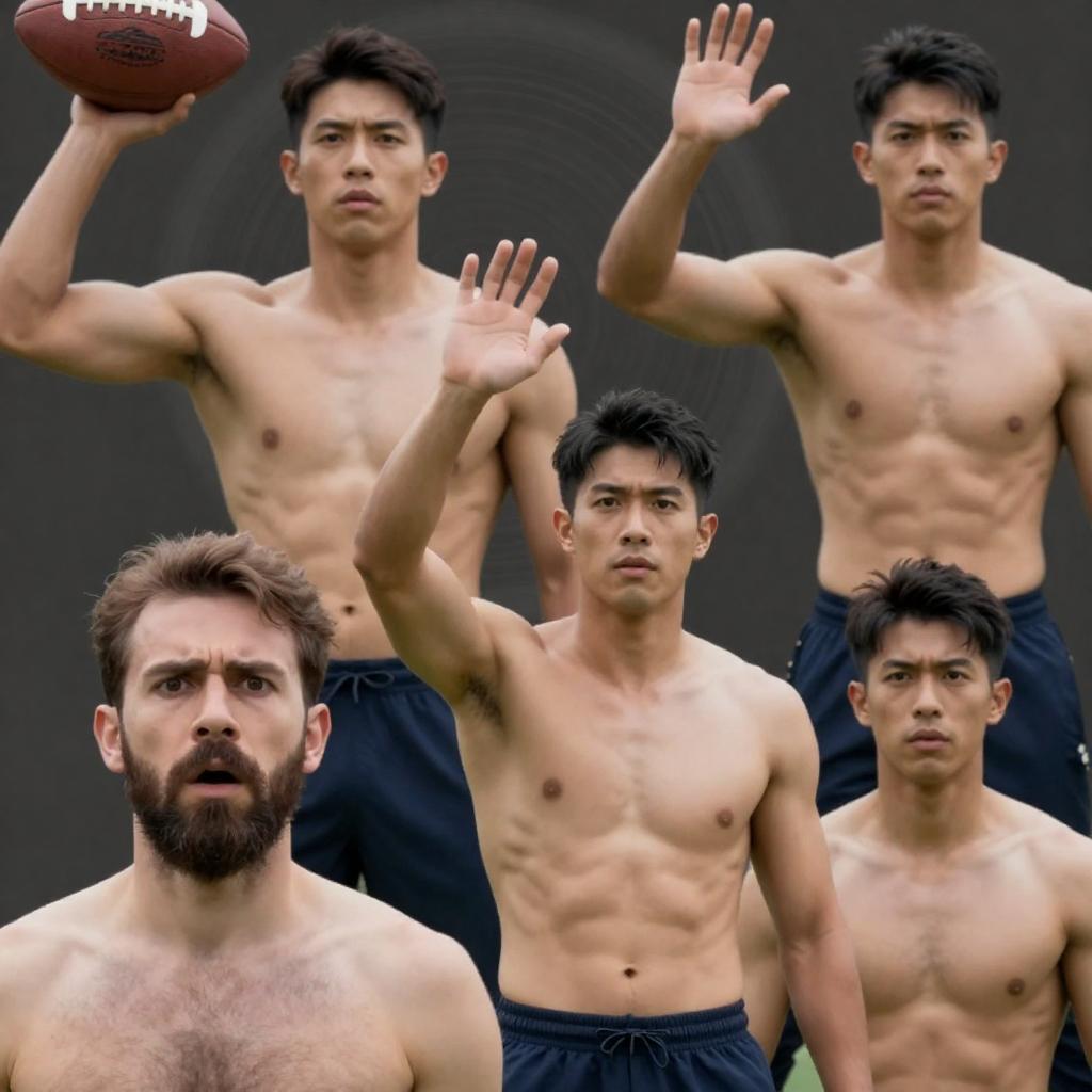 Photograph of multiple images of a man with black hair, muscular build, and intense expressions. He is shirtless and wearing blue pants in one image, waving his hand in another. A bearded man with a shocked expression is in the lower left. Background features abstract swirls and a football-like object. Multiple versions of the man overlap, creating a dynamic composition.