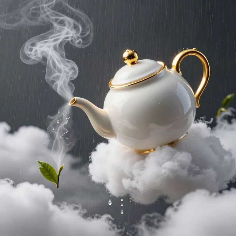 Photorealistic digital artwork of a white porcelain teapot with gold accents floating on fluffy white clouds in a dark, rainy sky. The teapot's spout emits wisps of white smoke, and a single green leaf drifts nearby. Raindrops are visible, adding texture to the scene. The teapot's lid has a small, round, gold knob. The overall composition combines surreal elements with realistic details, creating a dreamlike atmosphere. The teapot's shiny surface contrasts with the soft, cloud-like texture.