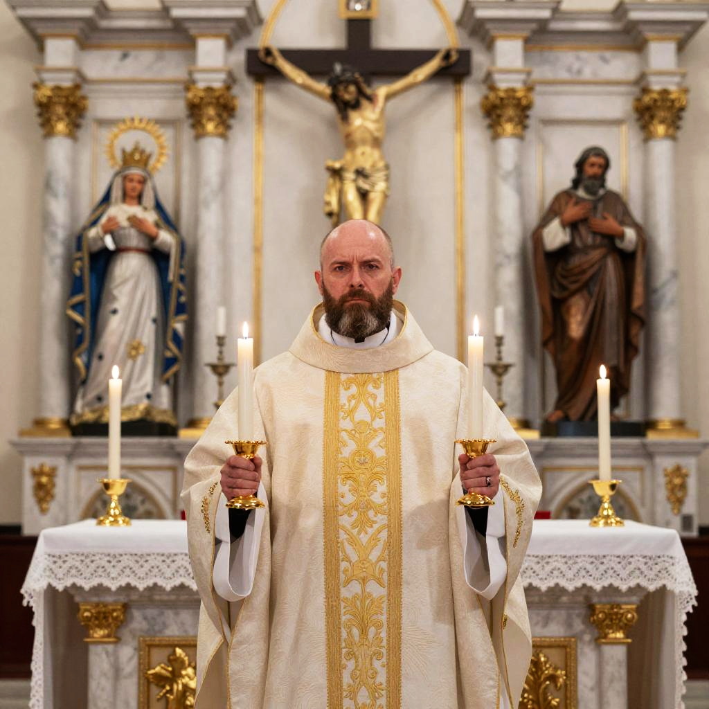 Photograph of a bald, bearded Catholic priest with a serious expression, standing in front of an ornate altar. He wears a white and gold ceremonial robe with intricate patterns, holding a chalice. The background features a decorated altar with two statues of Mary and Jesus, flanked by tall, lit candles. The altar is adorned with marble columns and gold accents, with a large cross centered above. The priest's robe contrasts with the white lace tablecloth on the altar. The overall setting is a traditional, ornate church interior.