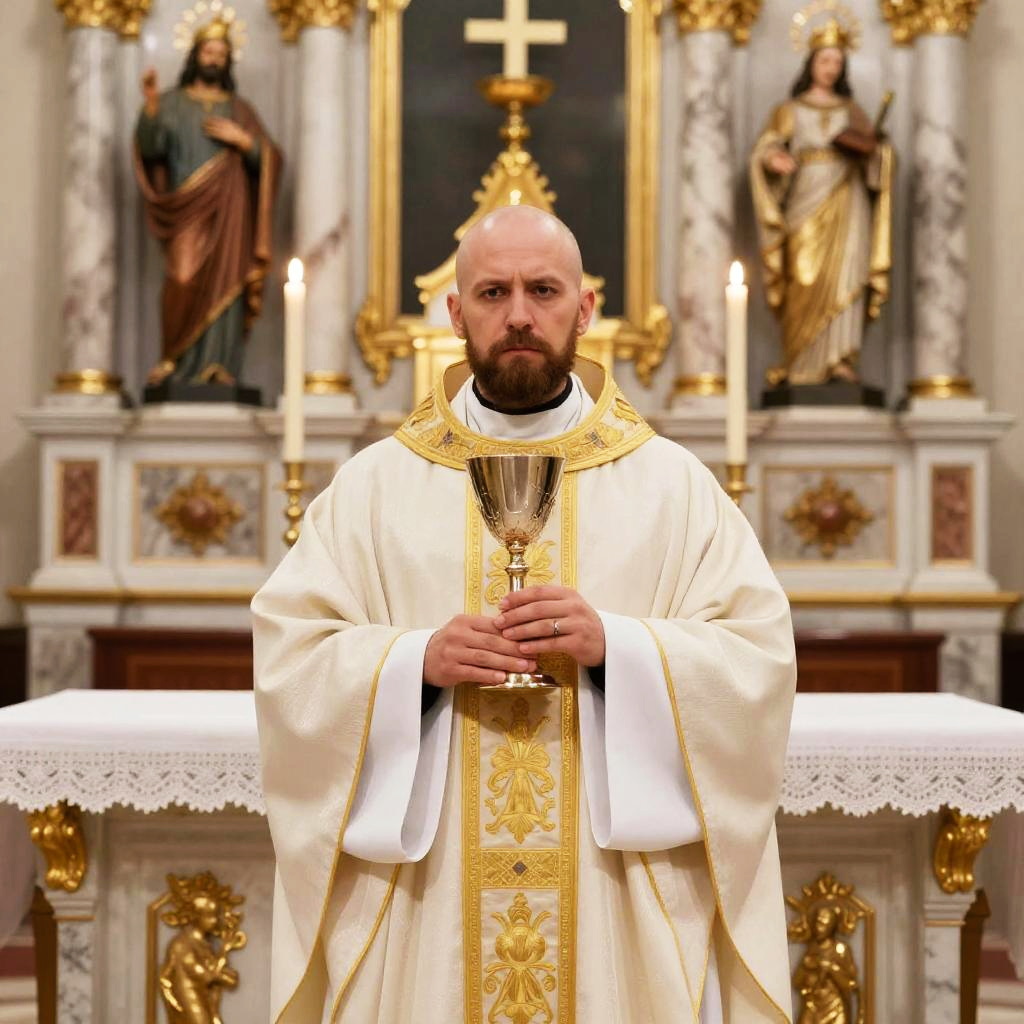 Photograph of a bearded Catholic priest with a bald head, wearing an ornate white and gold vestment, holding a chalice, standing in