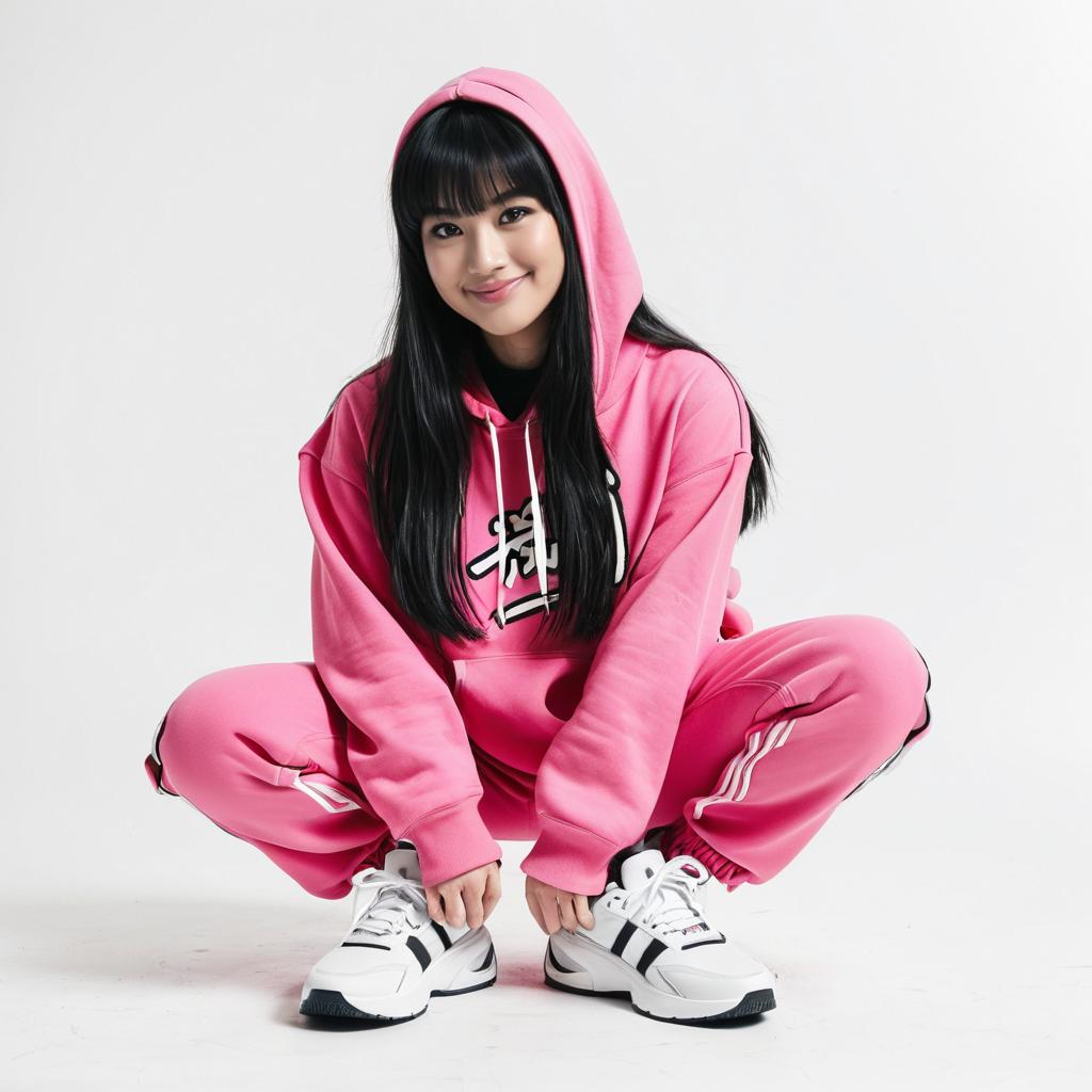 Photograph of an Asian woman with long black hair, wearing a pink hoodie and matching pink joggers, squatting, with white sneakers, against a