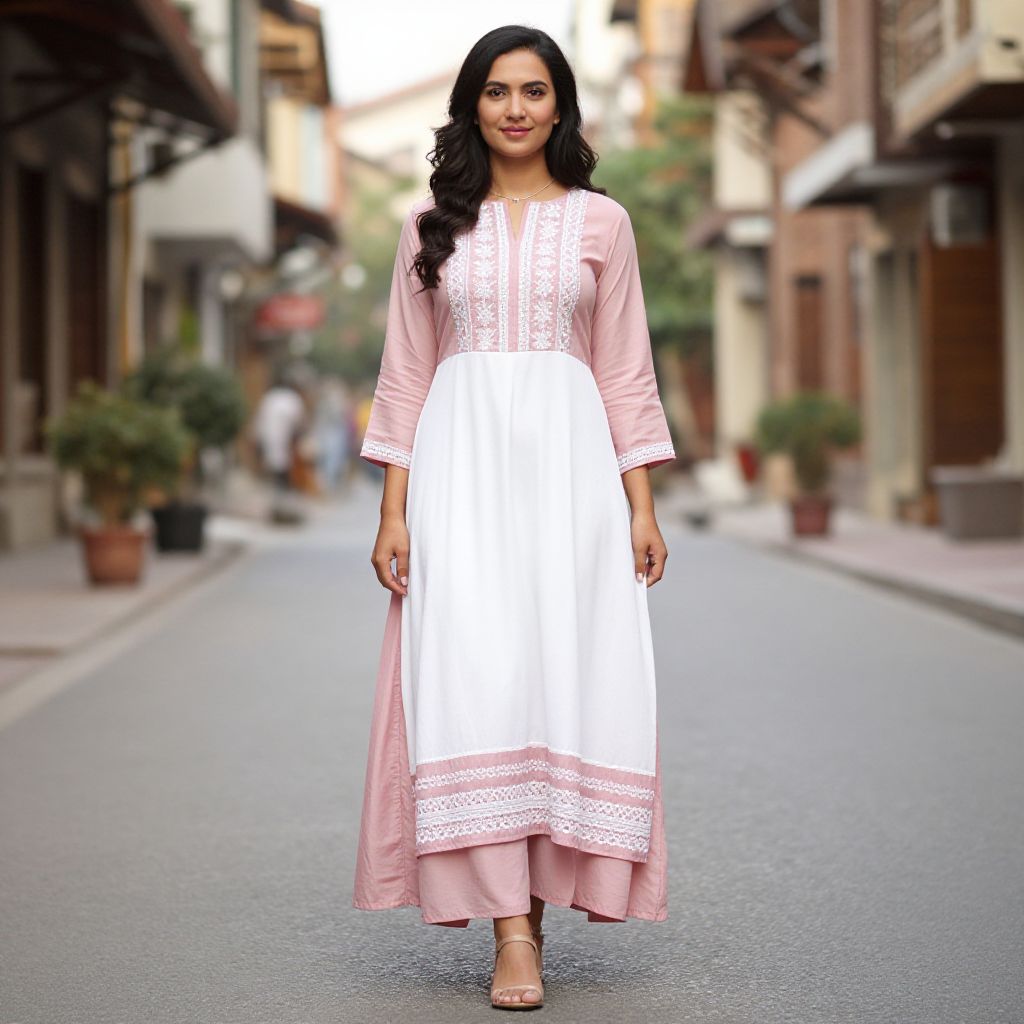 "Woman Designer Kurti Costume, woman in a pink and white dress standing on a street"