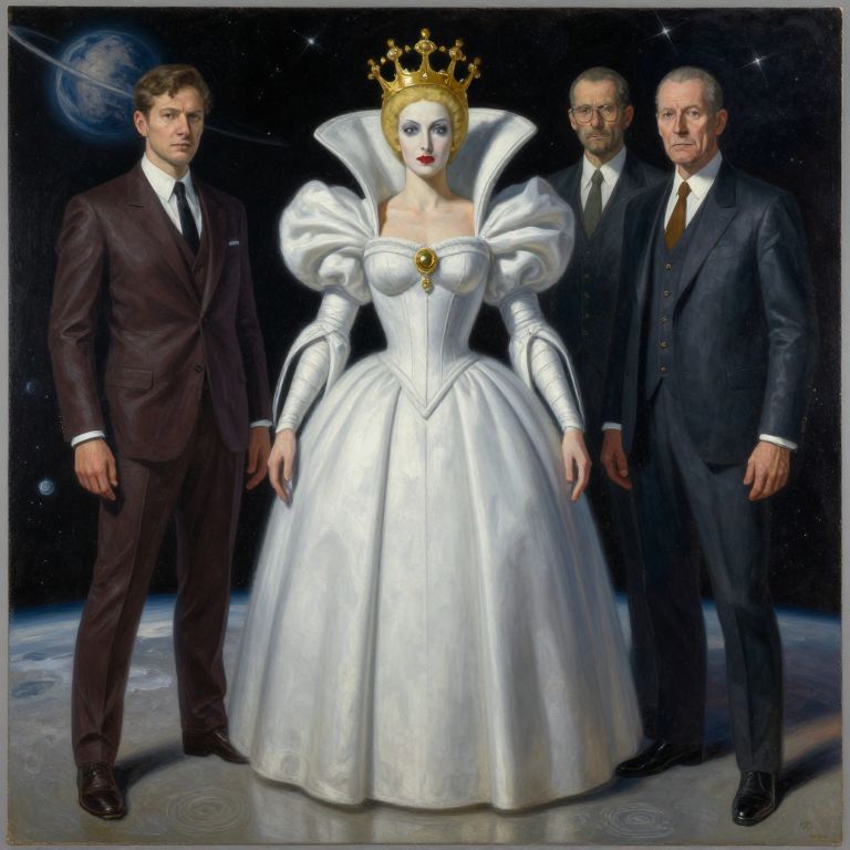 This photograph-like digital illustration features a fair-skinned woman with red lips and blue eyes, wearing a regal white gown with puffed shoulders and a gold crown. She stands centered between two men in dark suits and white shirts, one with a black tie and the other with a brown tie. The background is a dark, starry space with a visible planet. The woman's dress is highly detailed with a corset-like bodice and a full skirt, exuding a fairy-tale princess aesthetic. The men's expressions are serious, adding a dramatic contrast to the woman's elegant, almost otherworldly appearance.