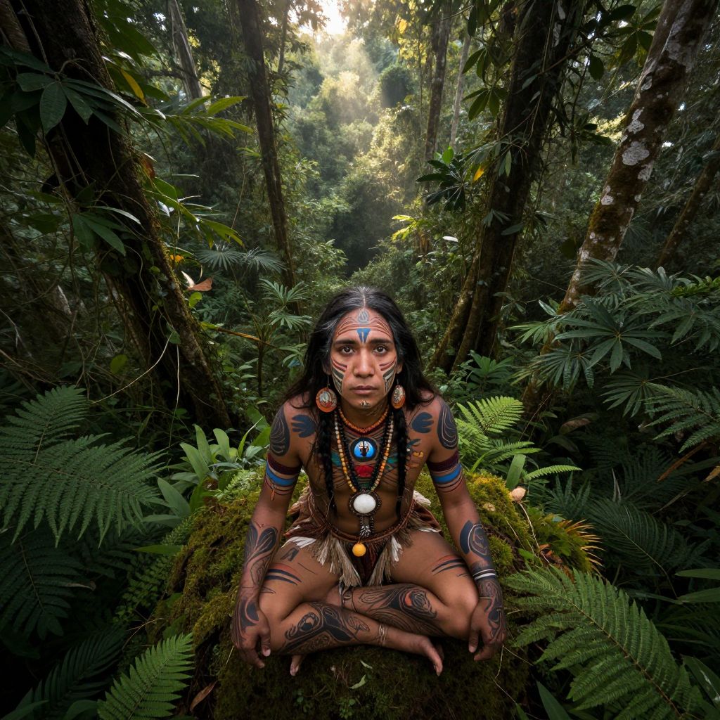Envision a hyperrealistic portrait of a modern shaman amidst a lush rainforest canopy from an aerial 'bug's-eye view' perspective. Adorned with vibrant tribal markings and intricate body art, they sit cross-legged against a backdrop teeming with exotic flora and fauna. Soft sunlight shafts pierce through the leaves above, illuminating their face and revealing a piercing gaze that exudes deep wisdom and ancient knowledge. This unique vantage point contrasts the primal beauty of nature with the timeless essence of the shaman, evoking an awe-inspiring emotional gradient as viewers are drawn into the mystical realm of this spiritual master.
