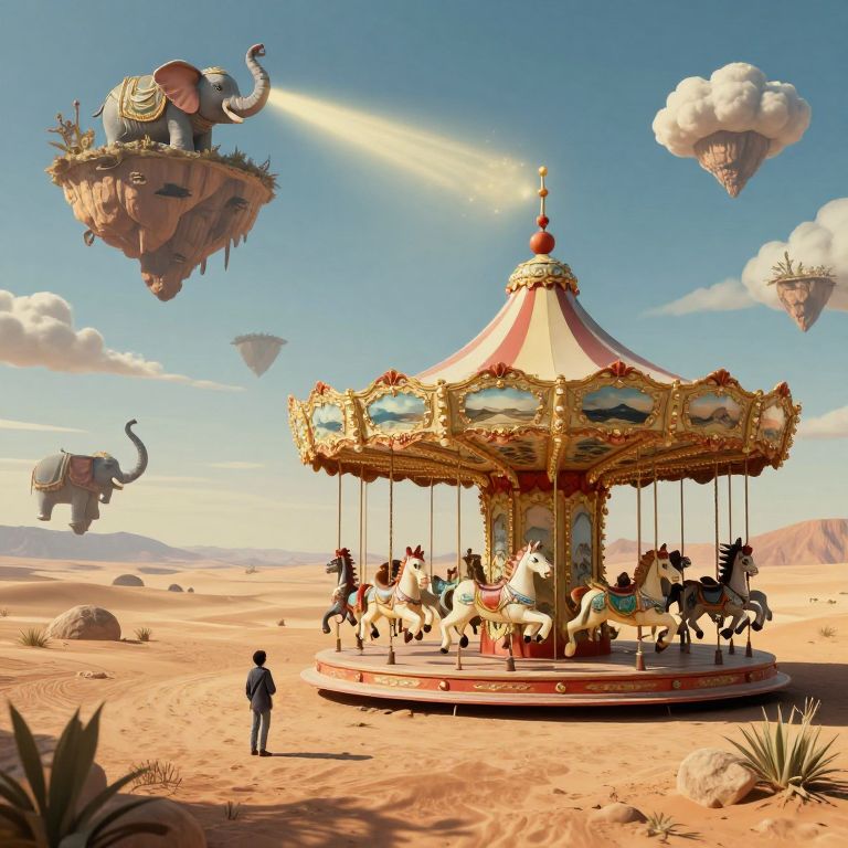 Visualize an otherworldly tableau where Dali-esque surrealism intertwines with Seuss-like whimsy. Envision a viewpoint from a diminutive observer on a fantastical carousel situated in the heart of an interminable desert. This carousel boasts oversized animal mechanisms, such as an elephant's trunk spiraling upwards into a sky brimming with adrift islands and dreamlike clouds. Perched atop one of these islands is a regal mythical creature, its radiant beam casting a spellbinding aura over the scene below. The carousel itself is embellished with intricate, logic-defying decorations that evoke a sense of wonder and curiosity in equal measure, beckoning the viewer on an emotional odyssey through this peculiar yet mesmerizing terrain.