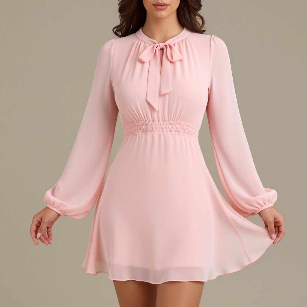 "Woman, girly, pale pink chiffon mini dress, bow tie at the neckline, long sheer bishop sleeves, gathered waist, flounce hem.. Sexy. Pretty face and beаutiful eyes. Big breasts."