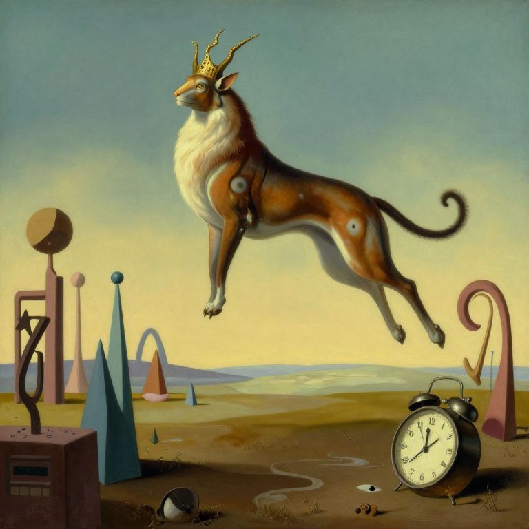 Digital surreal artwork: A crowned, antlered deer with a white chest, mid-leap, above a surreal landscape with geometric shapes, clock,