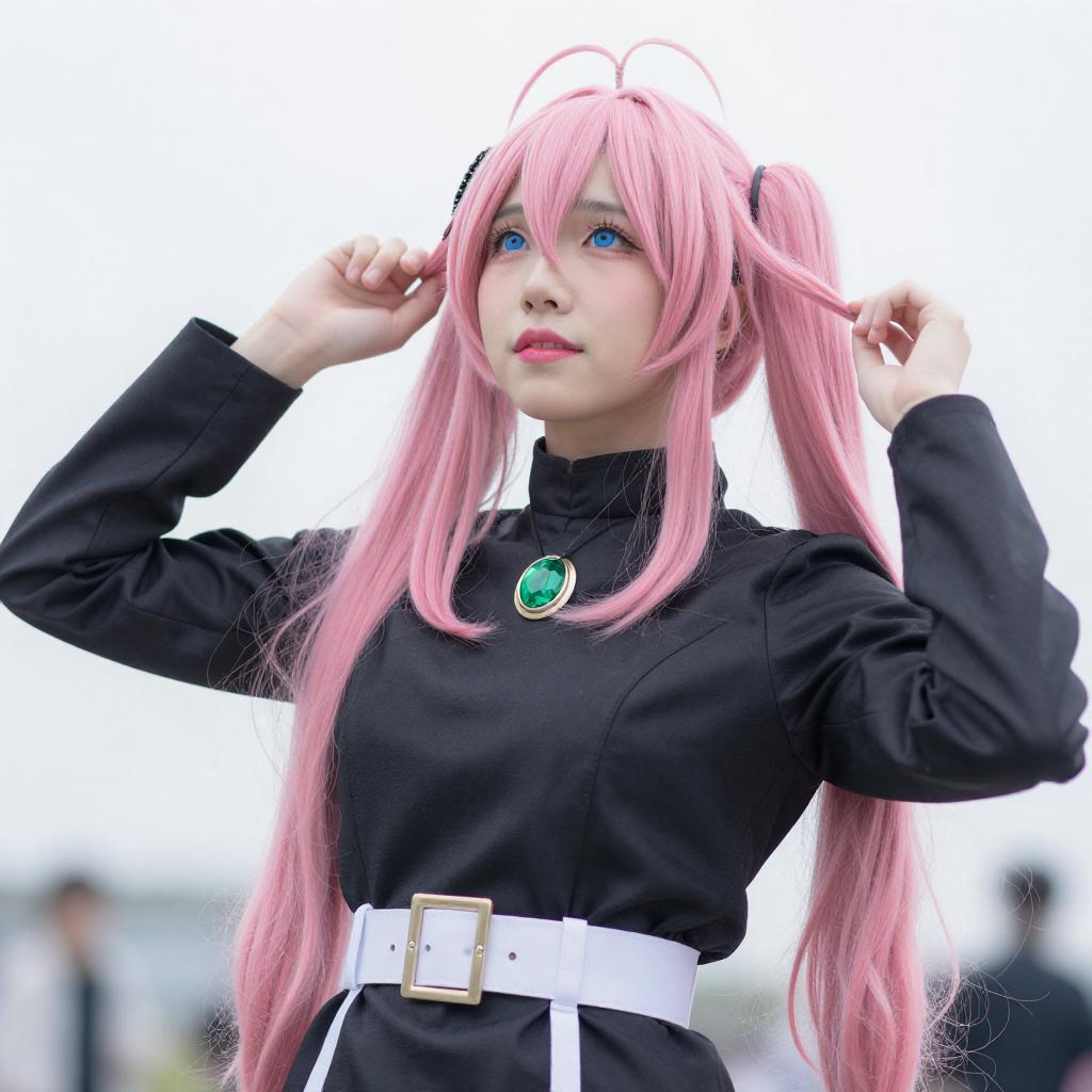 Photograph of a person with pink twin-tails, blue eyes, and pale skin, wearing a black off-shoulder top with a white wrap, and a green brooch. They are looking up with hands in hair, against a white background.