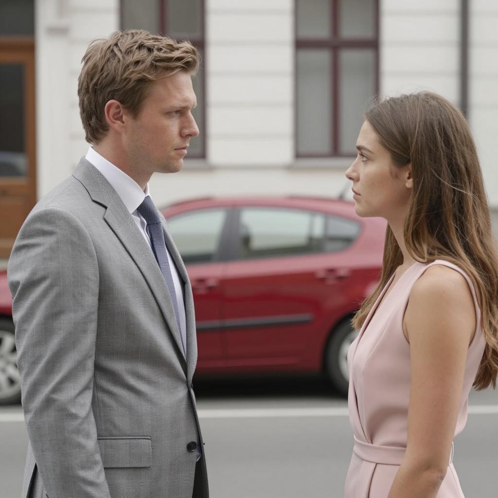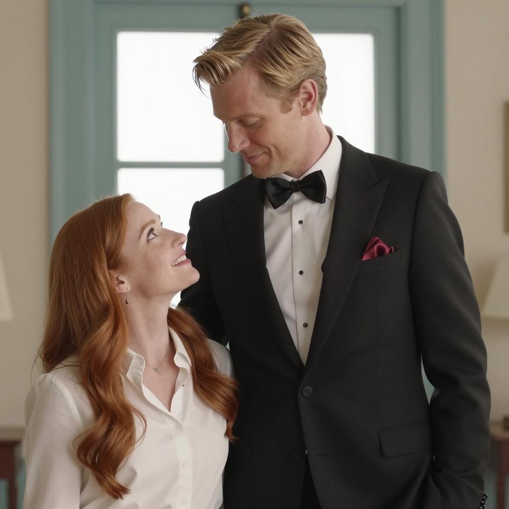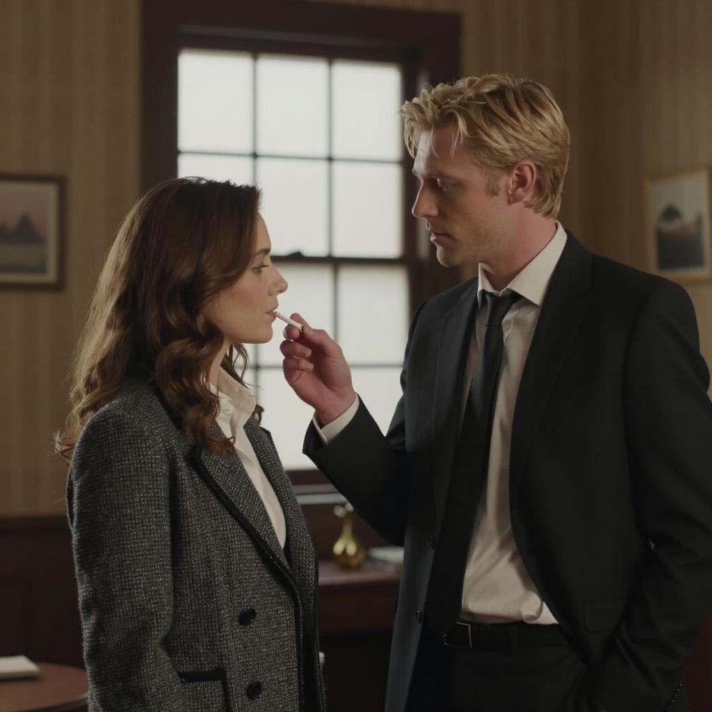 Photograph of two people in a room. Blonde man in black suit, white shirt, and tie, holds a cigarette to brunette woman's lips. She wears a gray tweed jacket, white shirt. Window with grid in background, brown patterned wallpaper, framed picture on wall. Woman looks down, man looks at her.