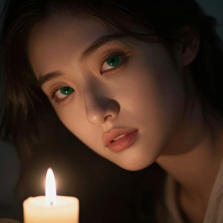 A hauntingly beautiful female figure, her porcelain skin bathed in chiaroscuro's soft glow, emerges from candlelit shadows. From an unconventional bug's-eye view, deep emerald eyes exude enigmatic allure, capturing a delicate balance of vulnerability and strength. This perspective highlights the intricate interplay between full lips and sculpted cheekbones, evoking melancholic longing within her visage.
