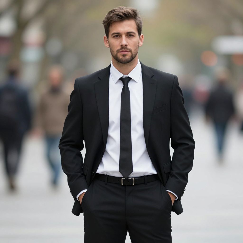 Photograph of a handsome, young Caucasian man with short, styled brown hair and a trimmed beard, standing confidently in a city street. He wears a black suit with a white dress shirt and a black tie, hands in his pockets. His expression is serious and focused. The background is blurred, showing out-of-focus pedestrians and trees, suggesting an urban setting. The overall color palette is neutral, with the black suit contrasting against the white shirt and the grayish background. The image has a sharp focus on the man, with a shallow depth of field.
