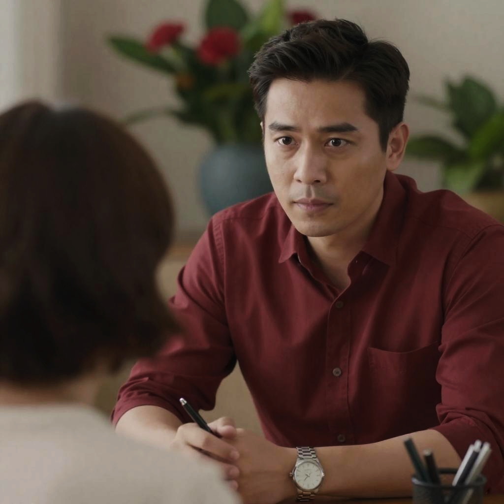 Asian man with slicked-back hair, white shirt, holding spoon, intense expression, peering through red-checkered curtain, dimly lit background, blurry figure in background.
