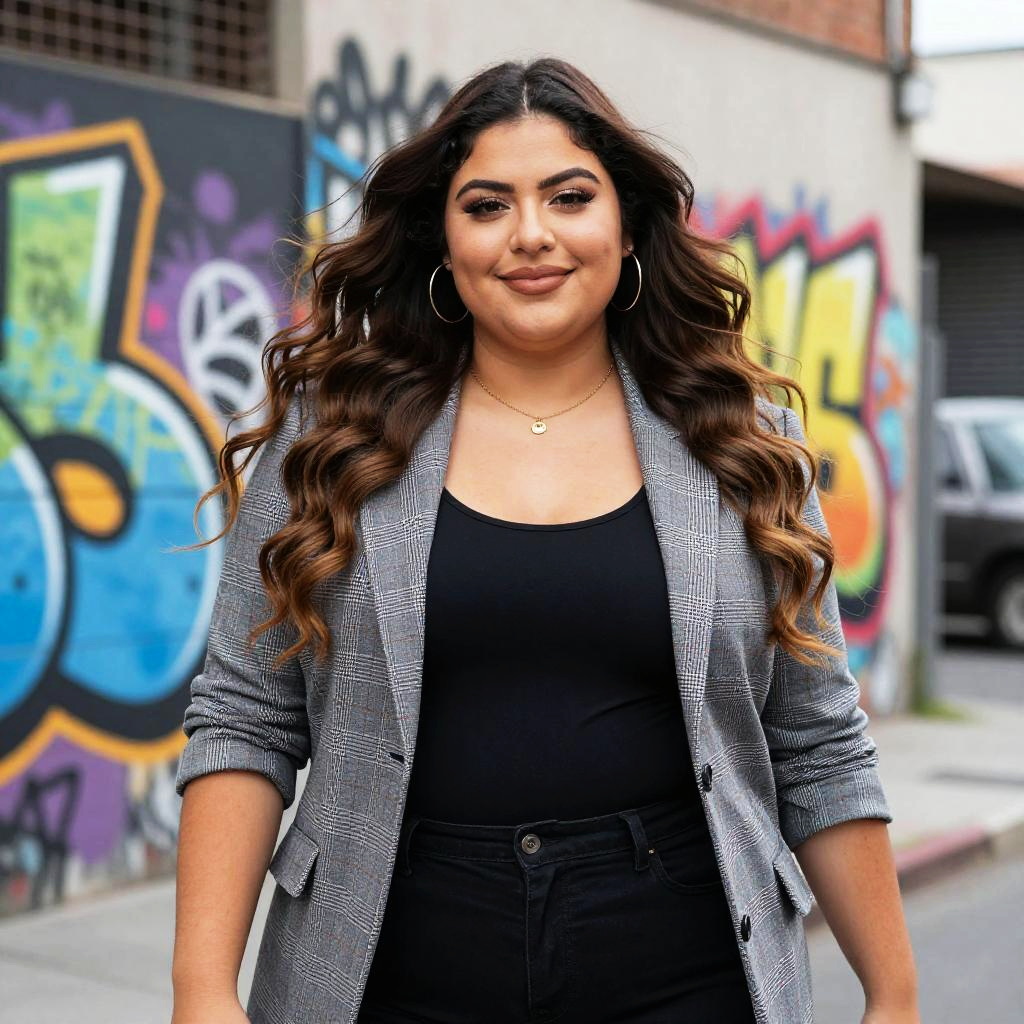 Thick Latinas embracing vibrant street fashion, surrounded by colorful urban murals, warm sunlight casting soft shadows, dynamic poses highlighting confident expressions, a blend of cultural richness and modern style in a lively city setting.