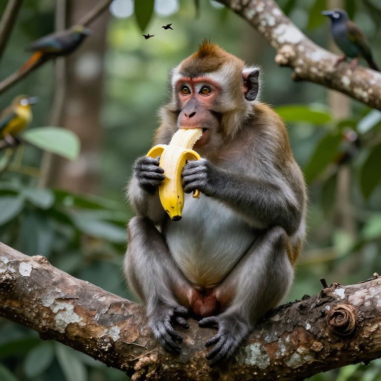 Overweight monkey snacking on a ripe yellow banana while sitting on a large tree branch, detailed bark texture, rich jungle environment with birds and insects, natural lighting with soft shadows, expressive eyes showing contentment.