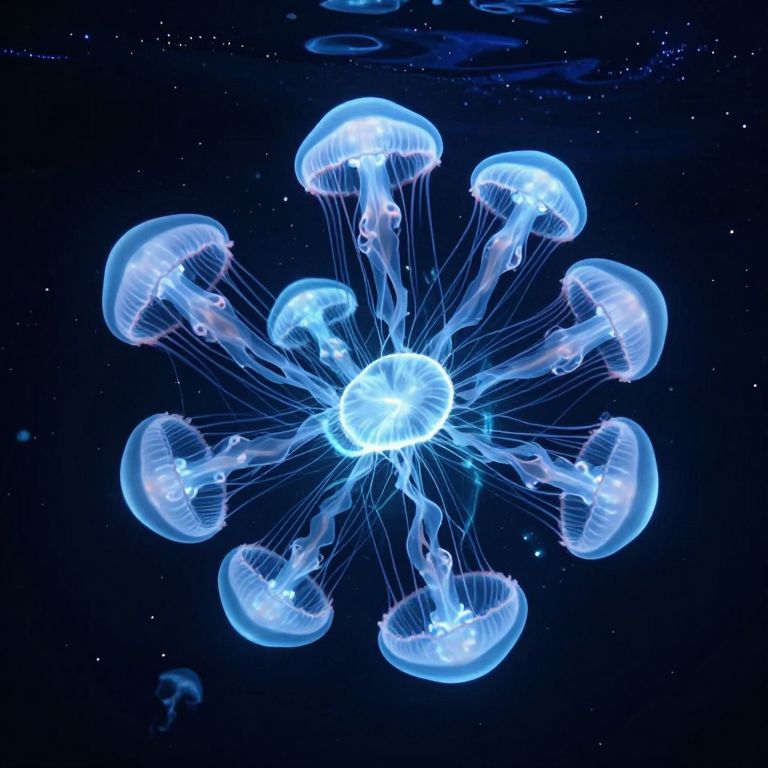 Glowing translucent jellyfish cluster together in a radiant formation, their ethereal luminescence illuminating a dark, star-studded expanse that resembles a liquid night sky, with smaller jellyfish drifting gracefully around them like celestial koi in an infinite pond.