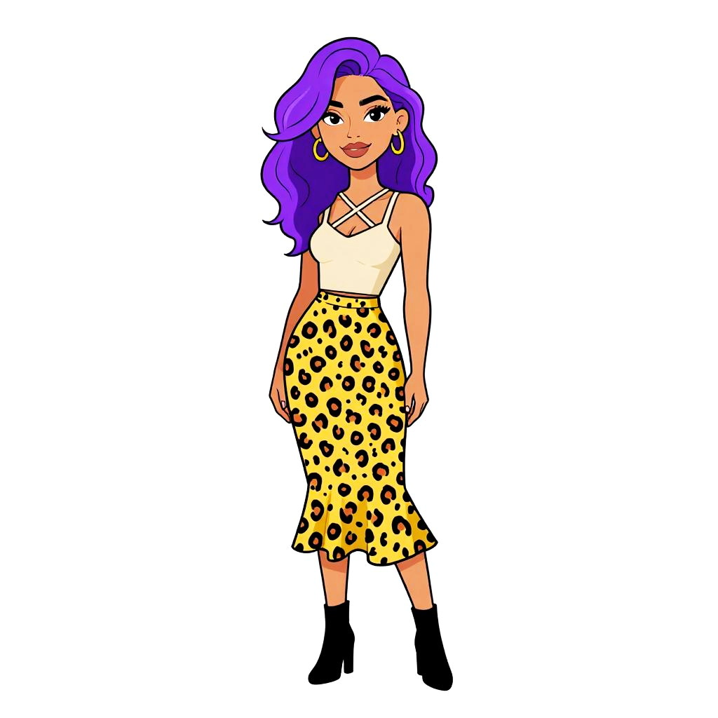 Illustration of a woman with vintage-inspired fashion wearing a white fitted crewneck sweater with three-quarter sleeves and a high-waisted A-line midi skirt featuring a cream and lilac floral pattern. She has long, wavy purple hair, black heeled pumps with matching floral details, a pearl necklace, pearl earrings, and a bracelet, all set against a neutral isolated background.