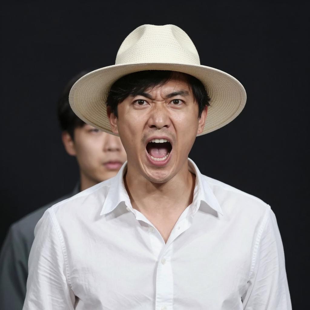 A man with dark hair and medium skin, wearing a white shirt and wide-brimmed hat, mouth open in an intense expression. Another partially visible person with dark hair stands behind him. Dark background.