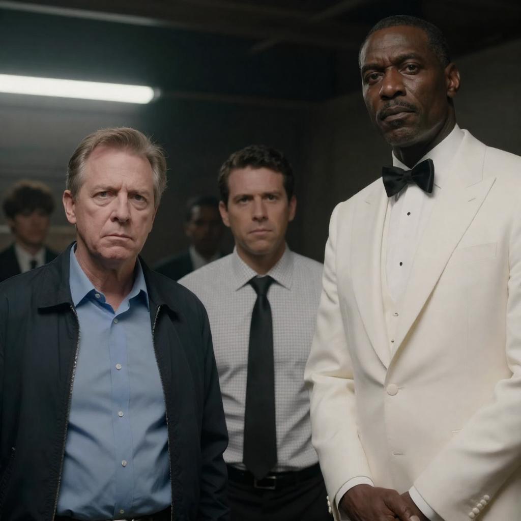 Photograph of three men standing closely together in a dimly lit room. An older white man with a white beard and mustache, wearing a brown tweed three-piece suit, stands on the left. A younger white man with short brown hair, in a white shirt and dark tie, stands in the center. An African American man with short hair, wearing a dark blazer with a school crest, stands on the right, looking at the older man. The background is blurred, with dark wooden panels.