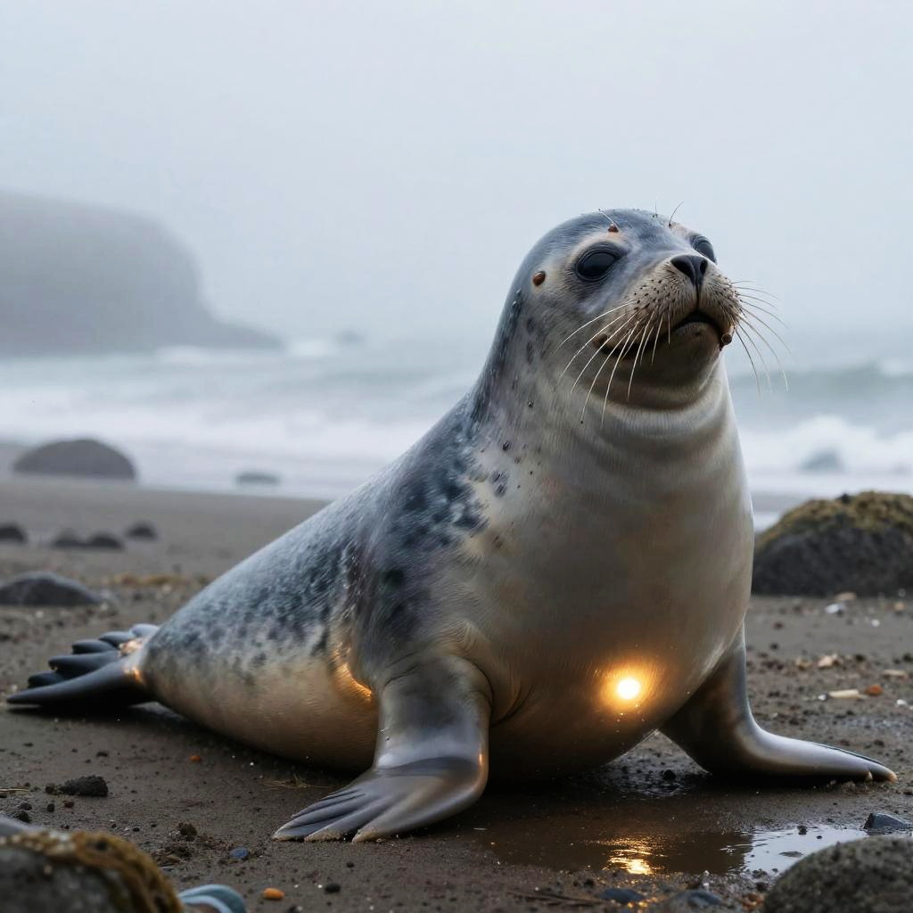 An imaginative hybrid of a seal and a glass buoy, featuring smooth skin glowing with inner light, set against a coastal foggy bay.