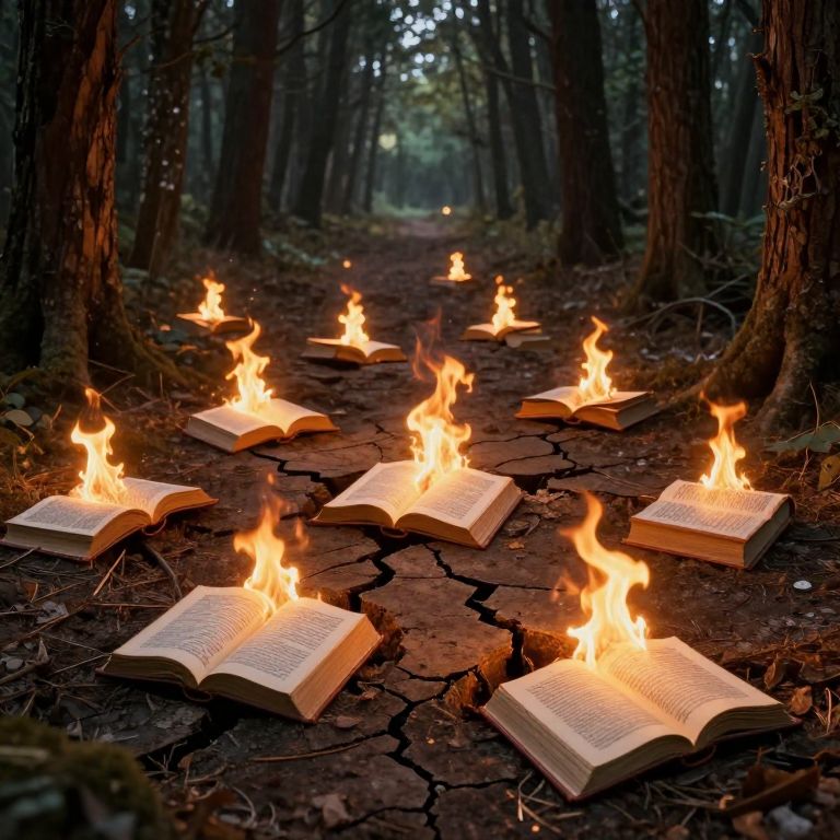 Photograph of open, burning books on a forest path, surrounded by tall trees, with bright orange flames illuminating the dark, cracked ground.