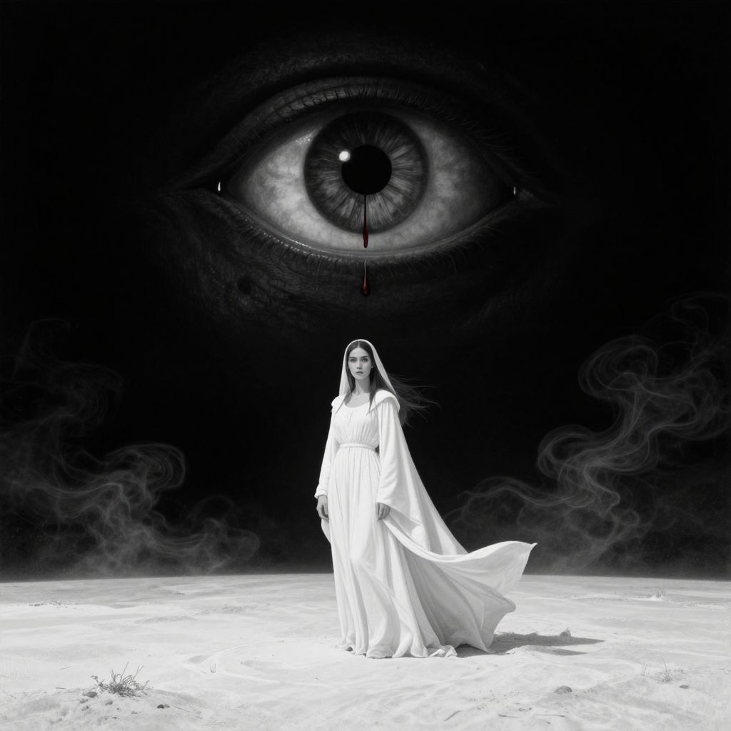 A dark surrealist long-shot illustration inspired by the haunting style of Hieronymus Bosch, showing a woman in a white, flowing robe standing on a flat, white sand landscape, Her robe trails dramatically, its ends floating as if lifted by an invisible force, Subtle, ghostly smoke lingers just above the sand, adding to the eerie atmosphere, Behind her, a pitch-black background reveals only the massive eye of a mythical beast, its gaze unblinking and ominous, The eye, drawn in monochrome, has a single drop of red blood slowly dripping from its left side, creating a stark contrast in the darkness, The scene combines medieval themes and surrealism, with intricate details to bring out the woman’s isolation and the strange, powerful presence of the hidden creature, grng3, DNdGr41nyB0yz style