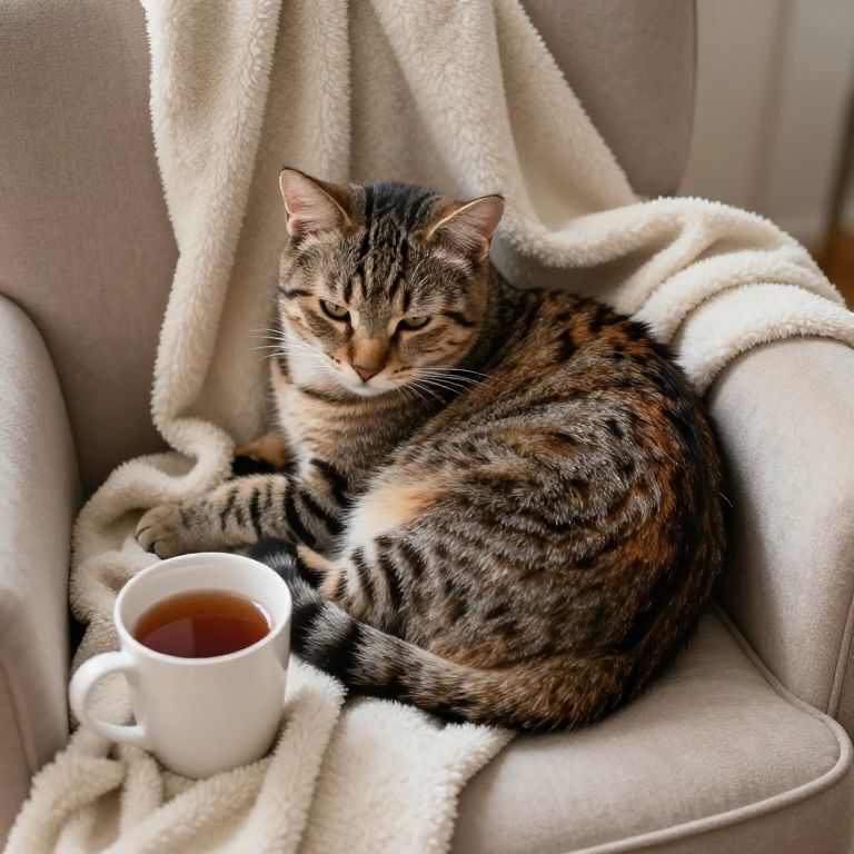 A warm and inviting image of a cat curling up on a plush armchair, surrounded by soft blankets and a mug of tea, highlighting the comforting presence of a feline companion