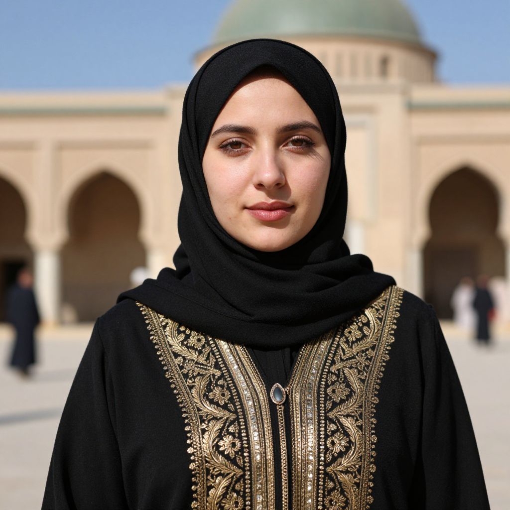 Photograph of a young woman with fair skin and brown eyes, wearing a black hijab and a black robe with intricate gold embroidery on the chest. She stands in front of a blurred, sunlit building with an arched entrance and a green dome, suggesting a historic or religious site. The background includes a clear blue sky and a few indistinct people. Her expression is calm and neutral, with natural makeup highlighting her features. The image has a sharp focus on her face and clothing, with a softer, bokeh effect on the background.