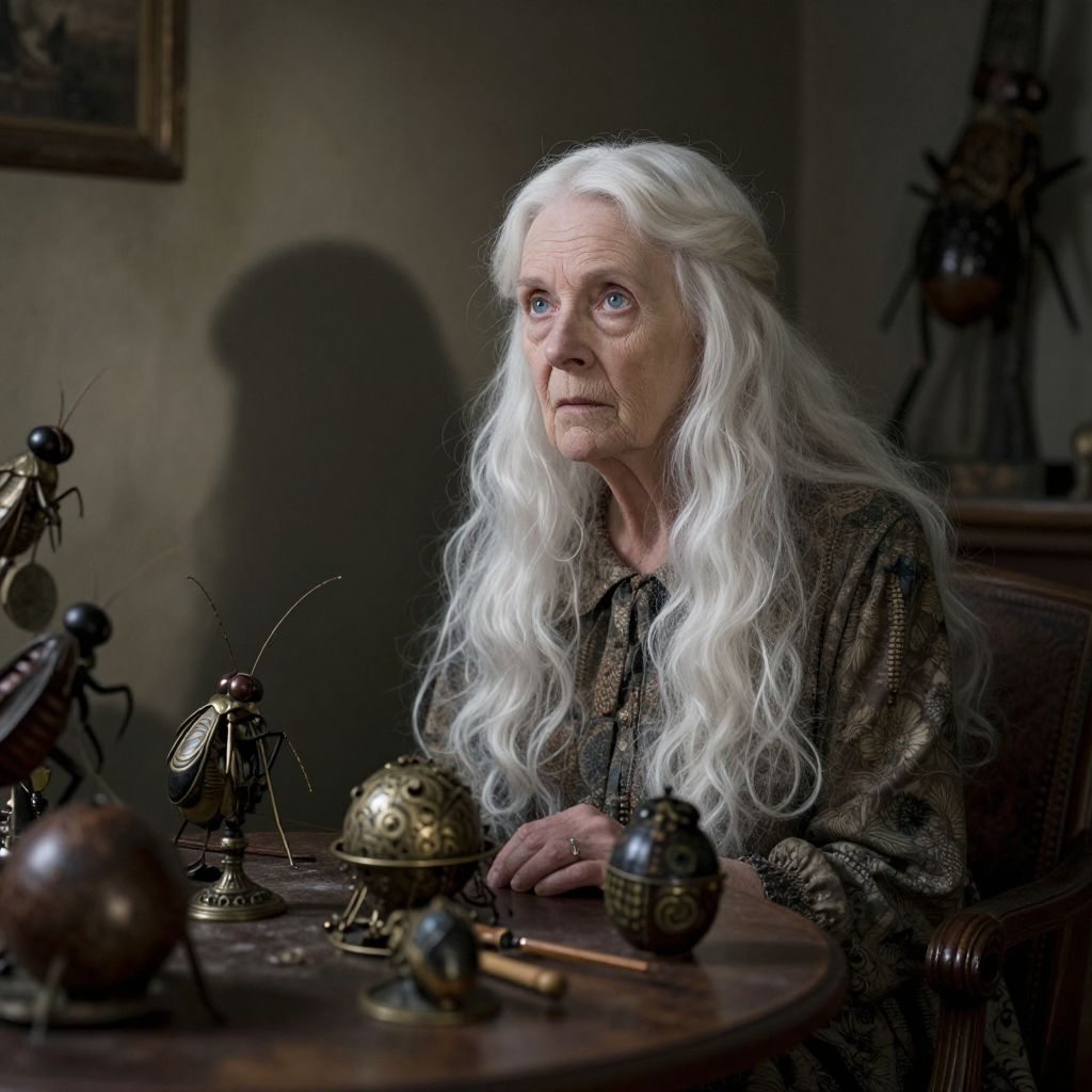 An image depicting a surreal scene from an insect's perspective, reminiscent of David Lynch's enigmatic storytelling. An elderly woman with long, flowing white hair sits at a small table surrounded by a collection of intricate, seemingly magical objects. Her intense blue eyes seem to hold hidden truths as she stares into the distance, deep in contemplation amidst this dreamlike setting. The environment is softly illuminated, casting elongated shadows that create an atmosphere that is both alluring and unsettling, leaving viewers curious about what lies just outside their field of view.