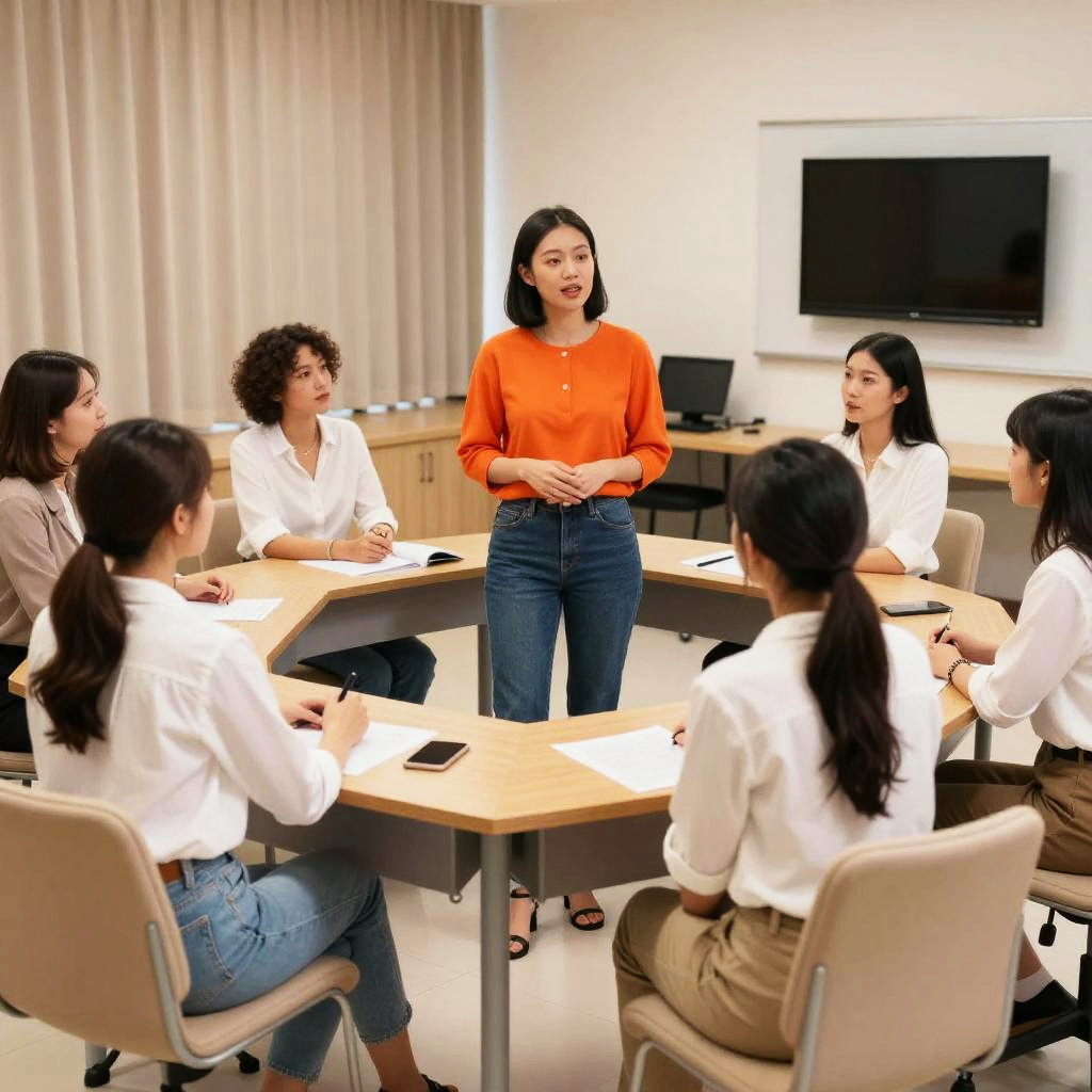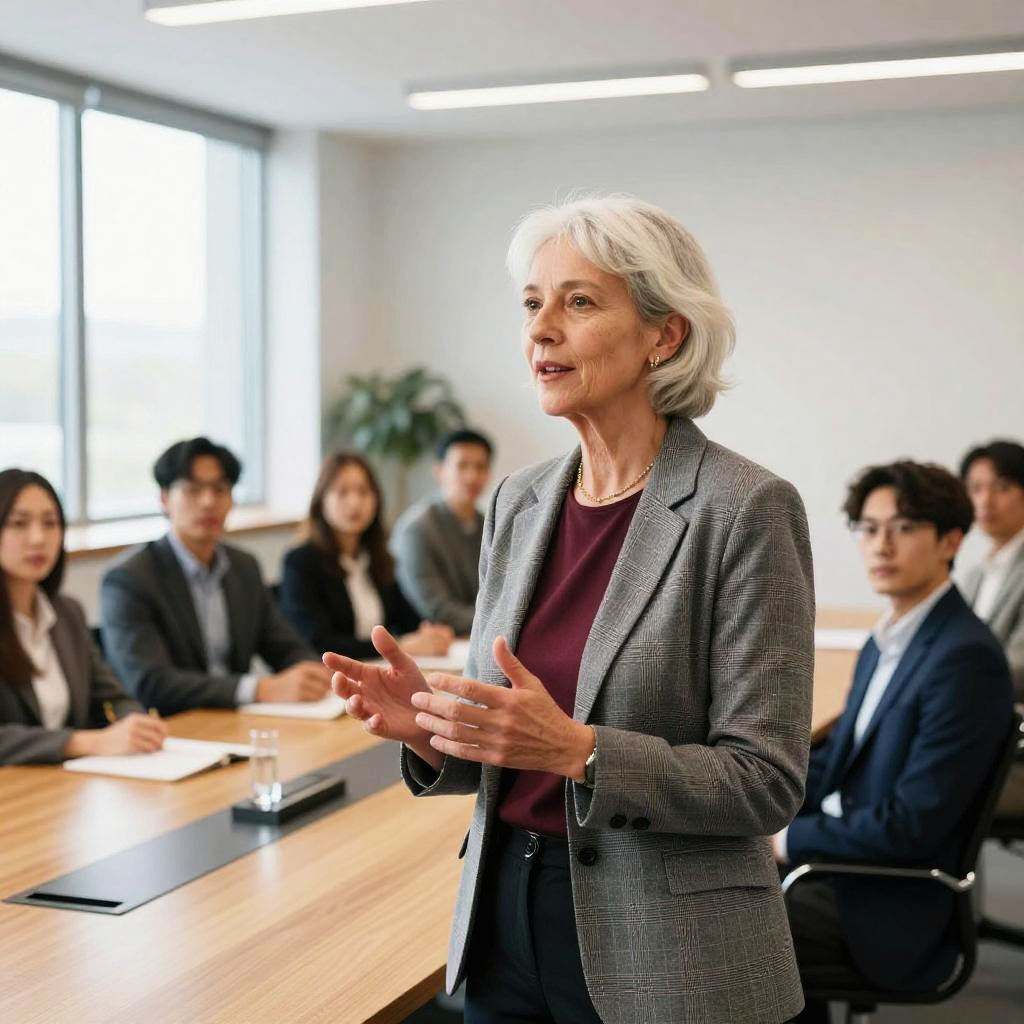 Photograph of a modern, well-lit conference room. A middle-aged man with short gray hair, wearing a black blazer and blue jeans, stands at the front, gesturing with his hands. He's speaking to a diverse group of people seated in black chairs, some with laptops. The room has white vertical blinds covering the windows, and a projector is visible on the left side.