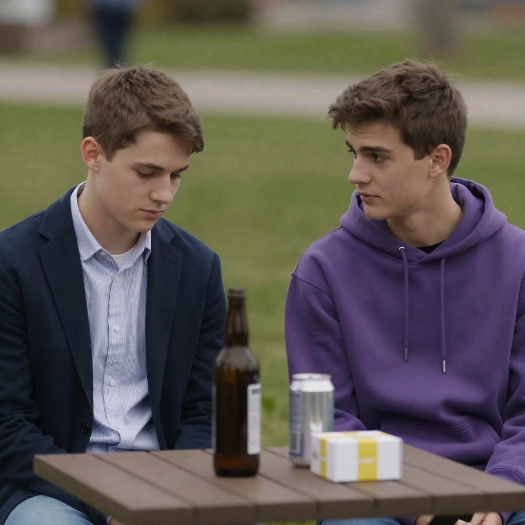 Photograph of two teenage boys at night. One boy kneels, pointing, while the other crouches, reaching towards trash on a wet street. Green dumpster with "2 G062" on the right. Both wear dark jackets and jeans. Rain-soaked pavement.