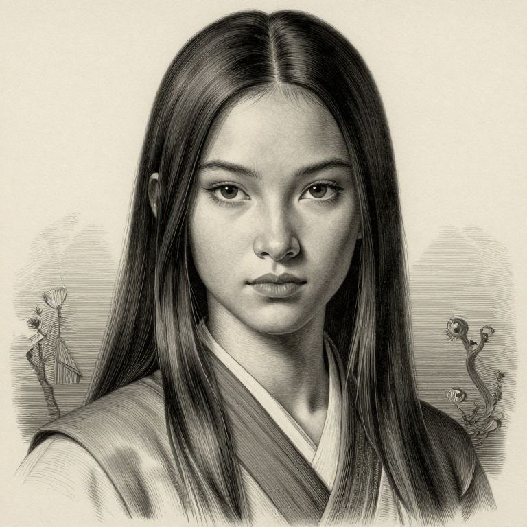 This is a highly detailed black and white digital drawing of an East Asian woman with long, straight black hair. She has a calm, serious expression, with large, almond-shaped eyes and subtle makeup. She is wearing a traditional Korean hanbok, characterized by its simple, flowing lines and geometric patterns. The background is minimalistic, featuring faint, delicate floral motifs on either side of her head. The artwork showcases fine cross-hatching and line work, giving it a realistic and textured appearance. The overall style is reminiscent of traditional Korean ink drawings, but with a modern, digital twist.