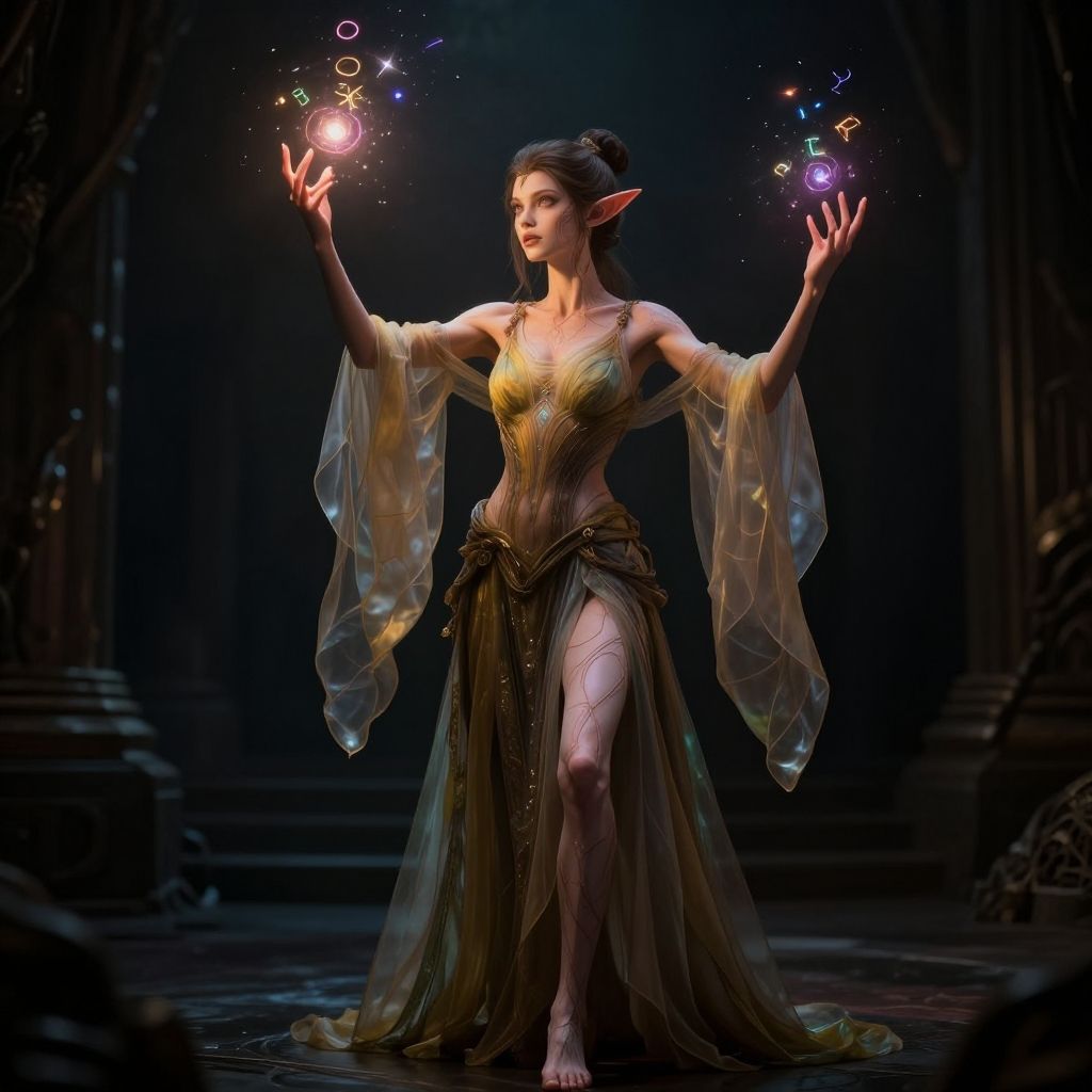Digital art of a mystical, elven woman in a glowing, translucent gown, casting colorful magic spells with outstretched arms in a dimly lit