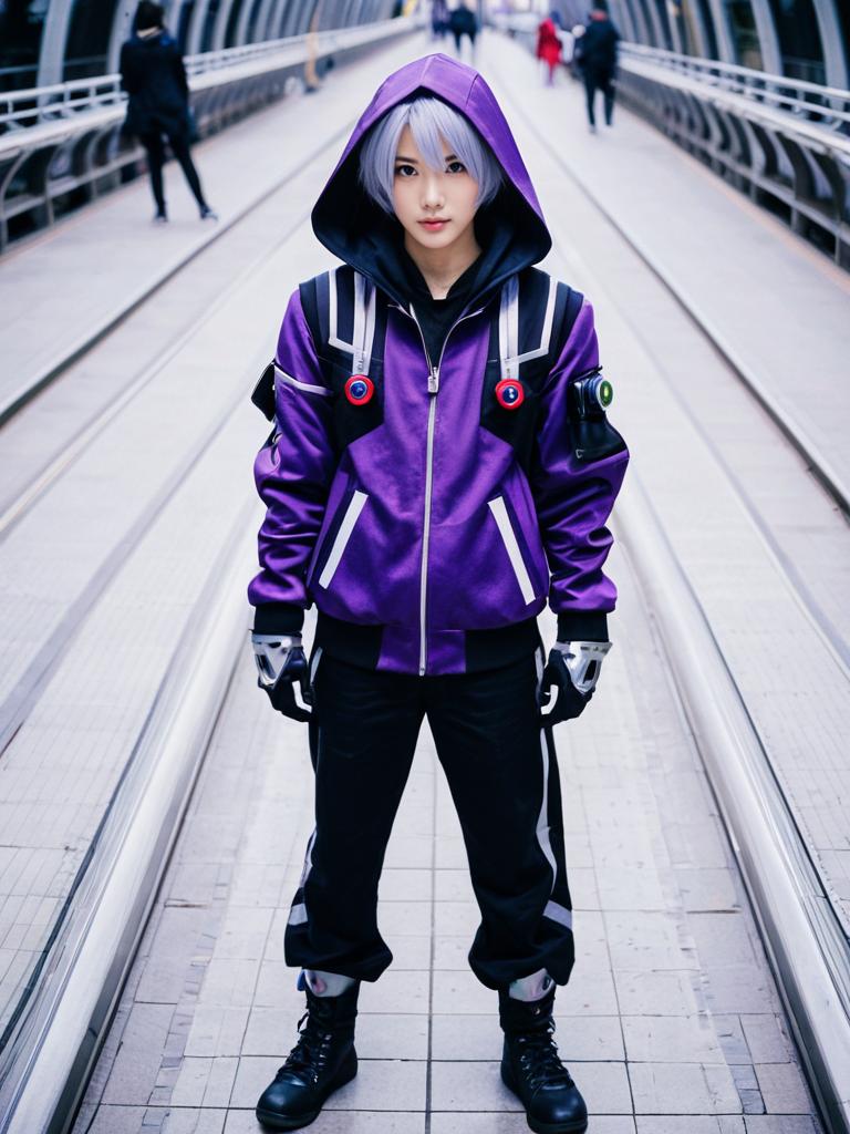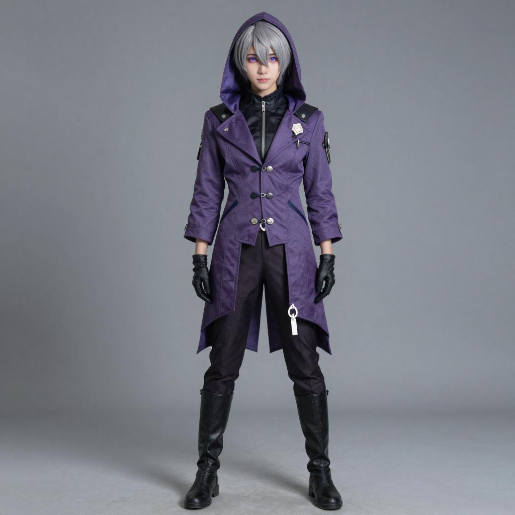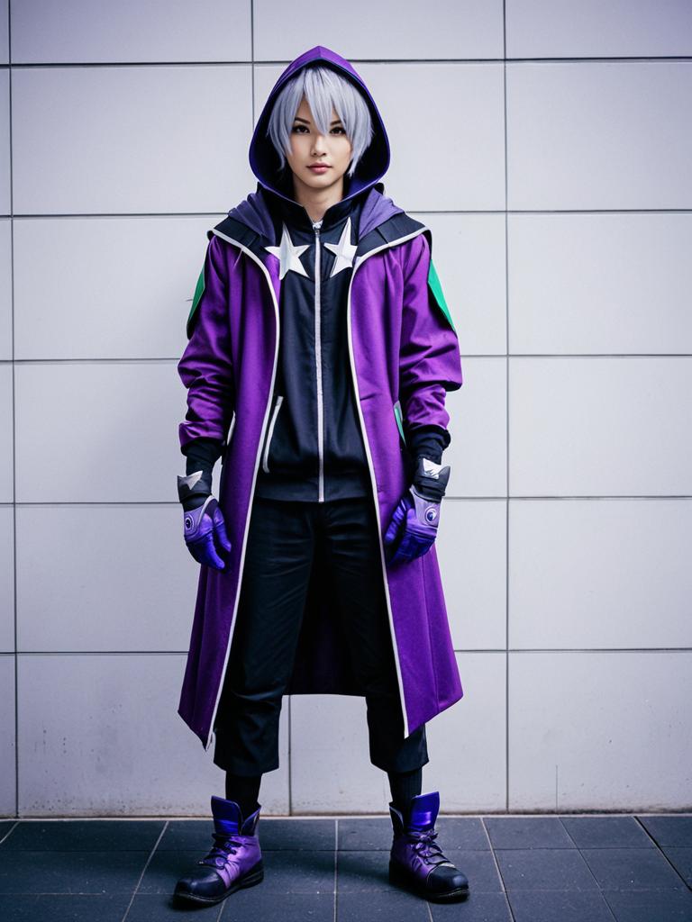 Photo-realistic cosplay photo of person in moze (honkai: star rail) costume. Full body. Standing. Full length. 1boy, hair between eyes, purple eyes, multicolored eyes, grey hair, short hair, purple jacket, black gloves, hood up, purple hood