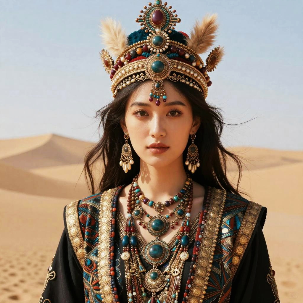 This striking image features a woman adorned in intricate jewelry and a majestic headdress, set against a vibrant desert landscape. The rich colors and ornate details evoke a sense of fantasy and elegance, reminiscent of legendary figures from ancient cultures.