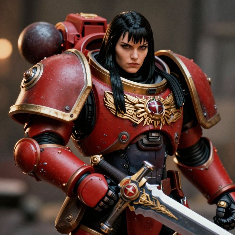 Close up, female RavenG40k holding a sword, clad in power armor, long black hair, with rich, vibrant colors and meticulous textures for her power armor, vignette, bokeh, moody, epic, film grain, grainy