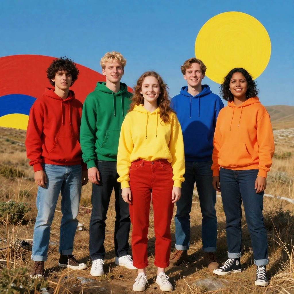 Realistic photo.Surrealism-infused travel scene featuring cosmic characters with colorful clothes and faces, vibrant landscape, cheerful expressions, painted in the style of Andy Goldsworthy, Chuck Close, Bridget Riley realistic photo