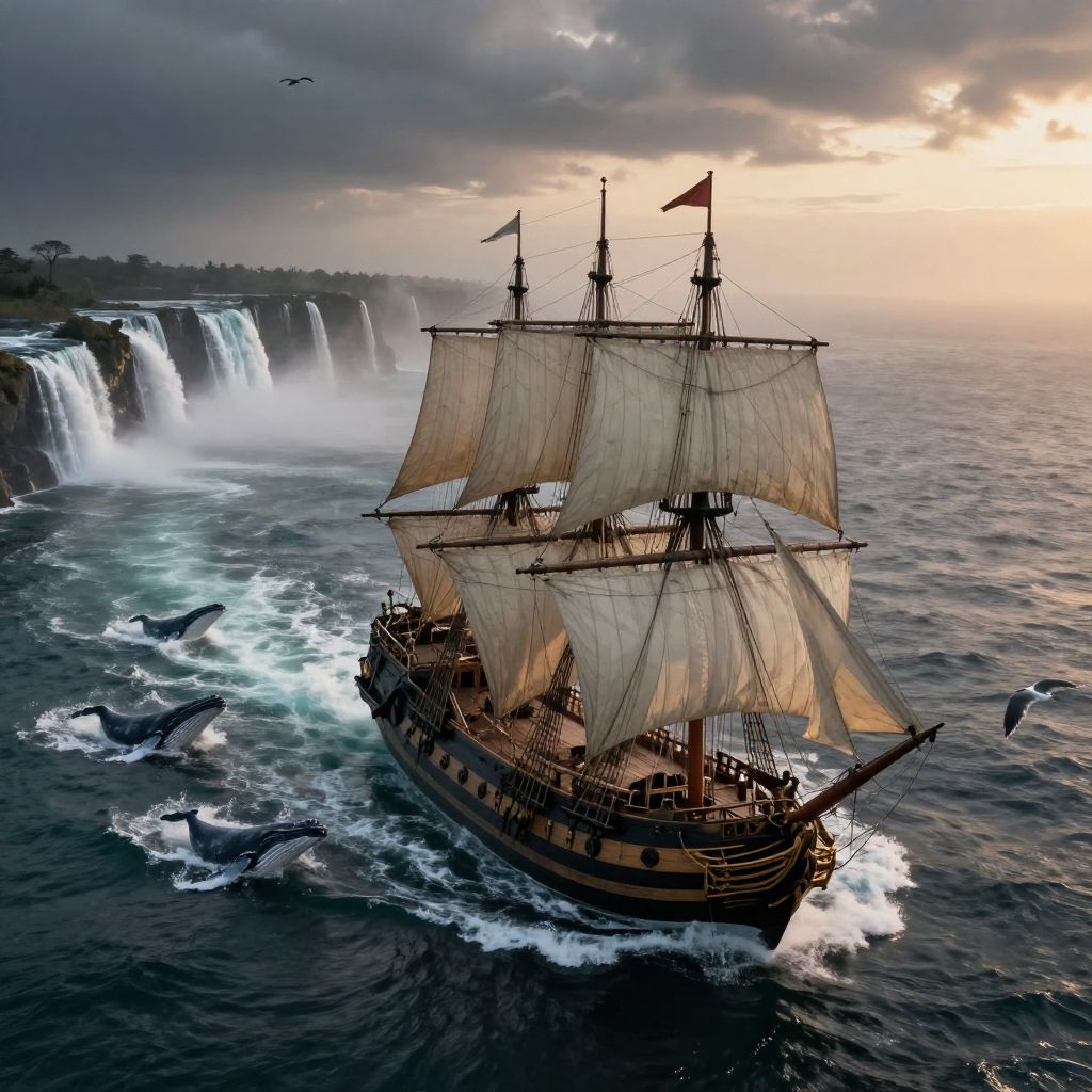 Aerial shot, Long Shot ( Dutch angle shot:1.4) (rotated camera angle)Fleet of 1800s pirate shipa sail on the ocean with whale companions, fall from crest, misty weather, dark, dramatic lighting, vertical, gravity, sunset, hyper realistic, VLS, (waterfalls on edge of ocean:1.2) (masterpiece:1.5) (seagulls:1.2) photographic reality, HDR, High resolution, cinematographic, artistic color variatons