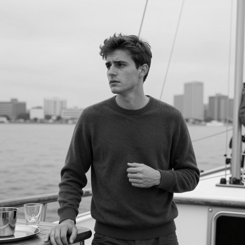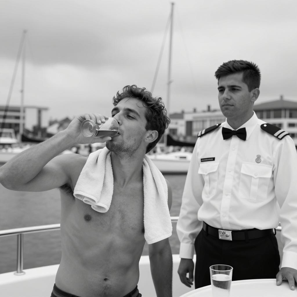 Black-and-white photo of two men on a yacht bar. One man is shirtless with dark hair, wearing sunglasses and a towel around his neck, leaning on the bar. The other man is dressed in a white shirt with rolled-up sleeves, a black bow tie, and a wristwatch, looking intently at the first man. The background shows a cityscape with multiple buildings, a marina with boats, and hills under clear skies.