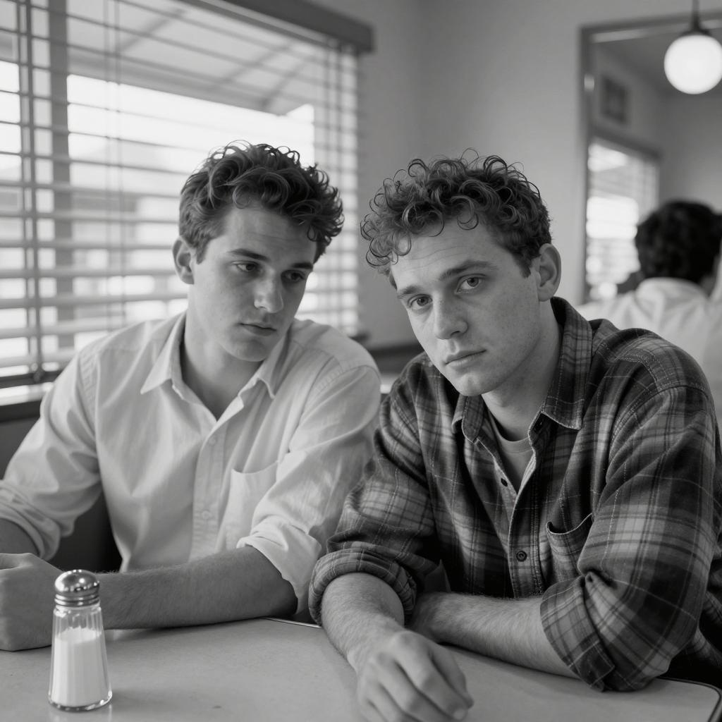 Black-and-white photograph of two men on a yacht. Shirtless man with dark hair, sunglasses, towel around neck, leaning on bar. Man in white shirt, bow tie, leaning on bar, looking at him. Background: cityscape, marina, hills. Both men have intense expressions. Objects: bar, metal cup, glasses. Number of people: 2.