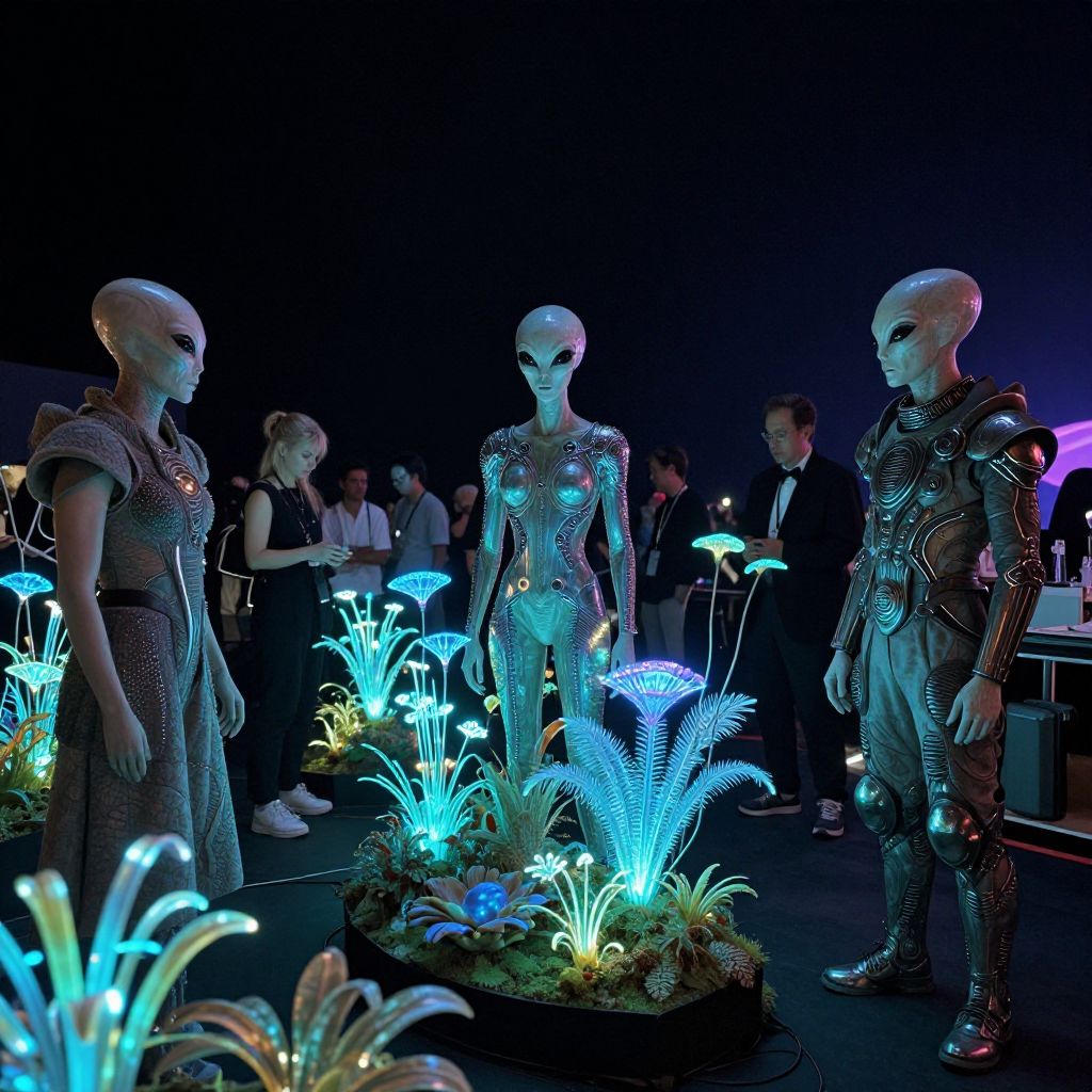Photograph of a futuristic exhibit featuring three humanoid mannequins with bald heads and metallic, armor-like outfits, standing amidst glowing, bioluminescent plants. The mannequins, illuminated in blue and purple light, face each other. The background is dark with a few people observing. The floor is black, and the bioluminescent plants are in rectangular planters, adding a sci-fi ambiance. The exhibit is set in a dimly lit, modern space, highlighting the futuristic and otherworldly atmosphere.