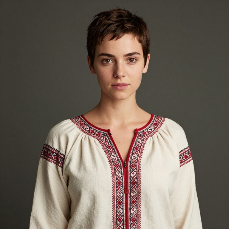 Photograph of a young person with short, dark brown hair and light skin, standing against a dark gray background. They have a neutral expression and are wearing a white, long-sleeved, traditional blouse with red and black geometric embroidery around the neckline, sleeves, and down the center front. The blouse has a slightly loose, flowing texture. The person's eyes are dark brown, and they have a slender build. The lighting is even, highlighting the details of the blouse and the person's facial features. The image has a realistic, studio portrait style.
