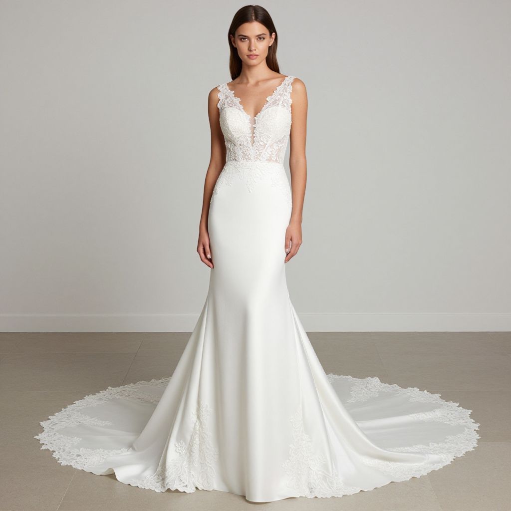 Photograph of a dark-haired woman in a white, long-sleeved, lace wedding dress with a low back and floral embroidery, standing against a