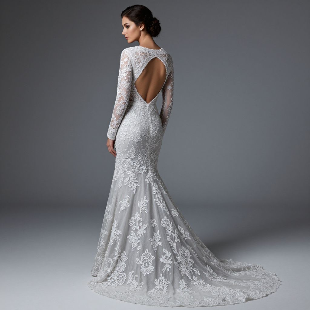 Photograph of a woman with light olive skin and dark brown, wavy hair styled in an elegant updo. She is wearing a form-fitting, long-sleeved white lace wedding gown with a deep, open back and intricate floral patterns. The gown features a mermaid-style silhouette that flares out into a long, trailing train. She stands with her back to the camera, slightly turning her head to the right. The background is a simple, gradient gray, highlighting the dress's detailed lacework. The lighting is soft, casting subtle shadows that emphasize the gown's textures and contours.